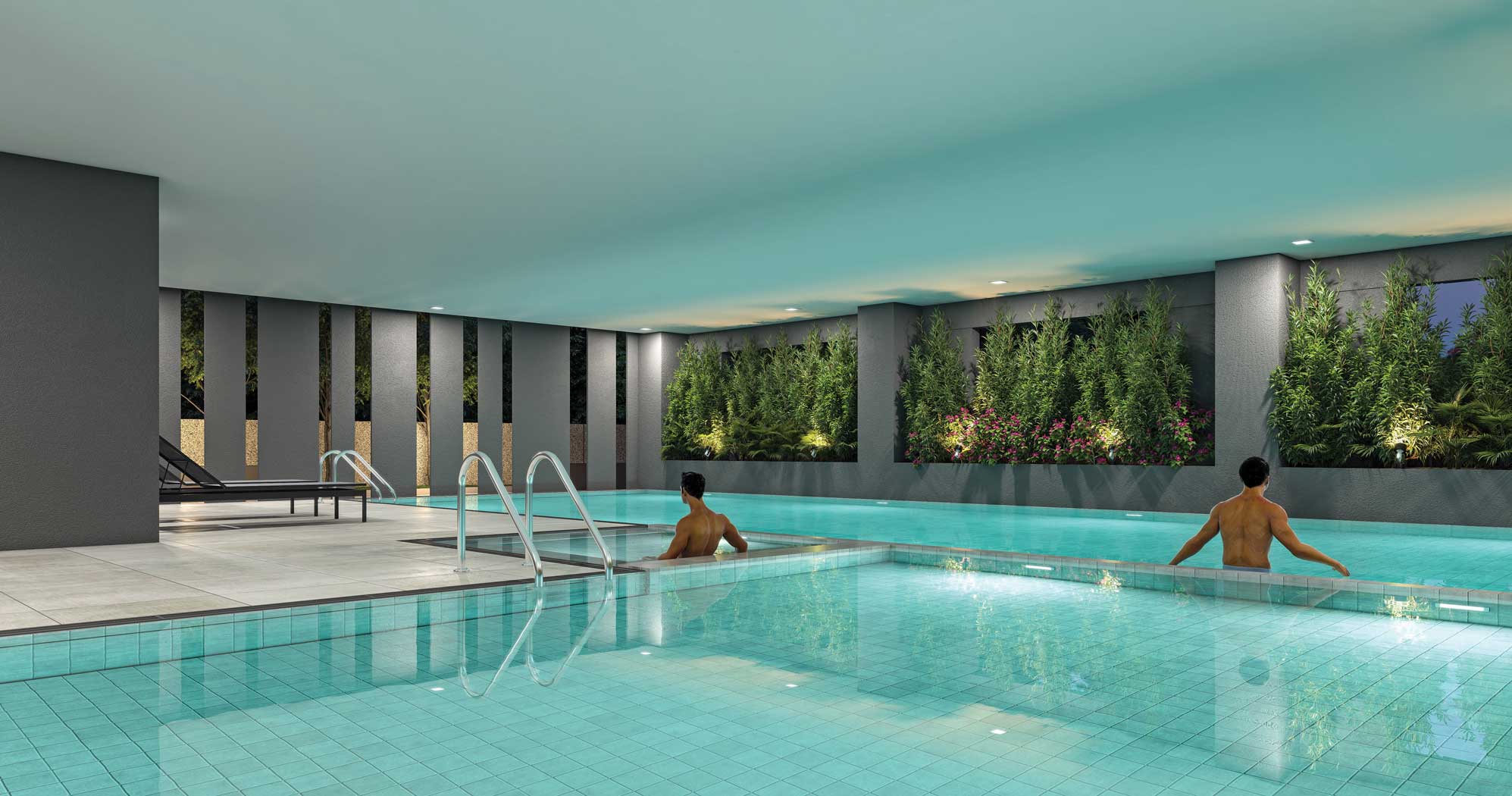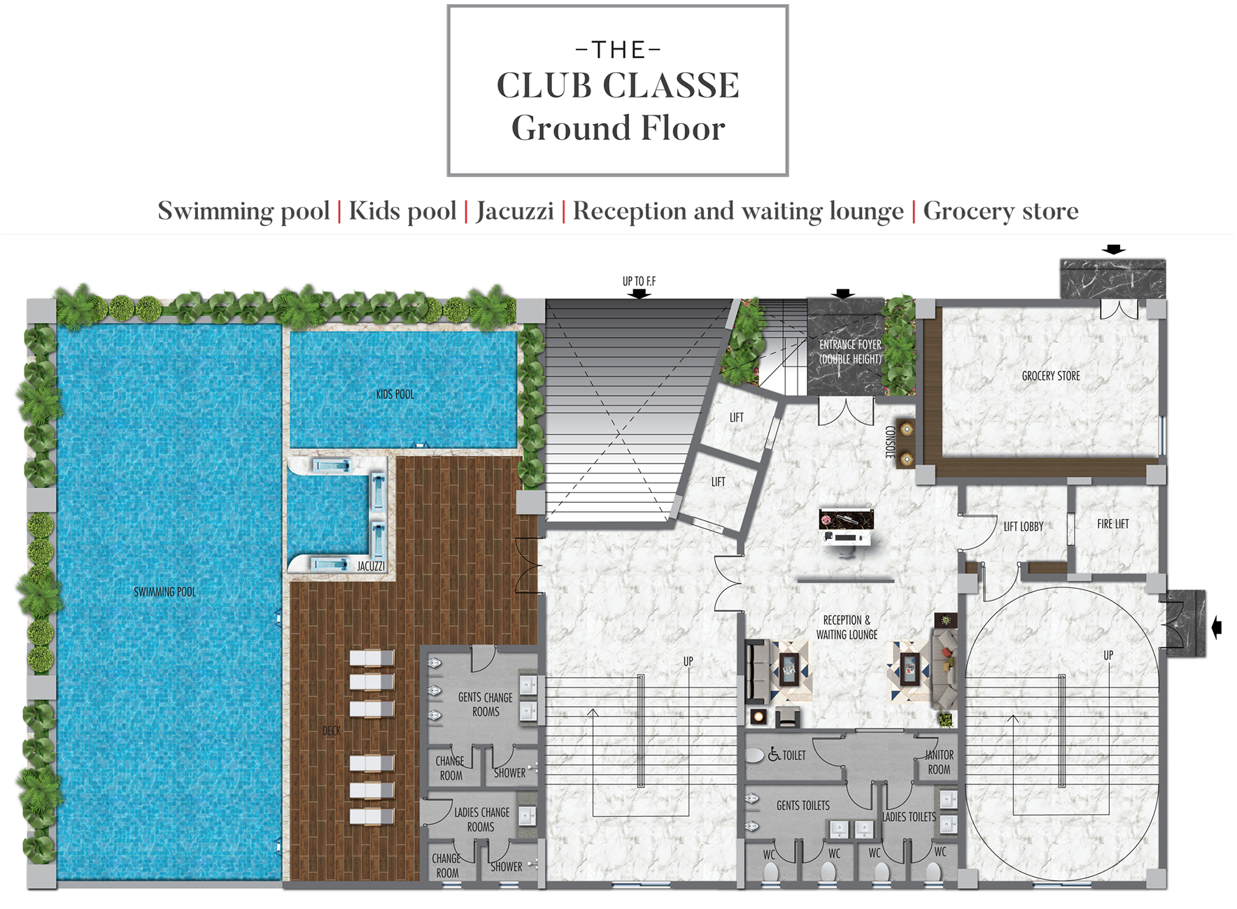 The ground floor of the Club serves as a roof for the fully covered swimming pool that has pretty landscaping all around. There is also a kid's pool, jacuzzi and furnished deck area.