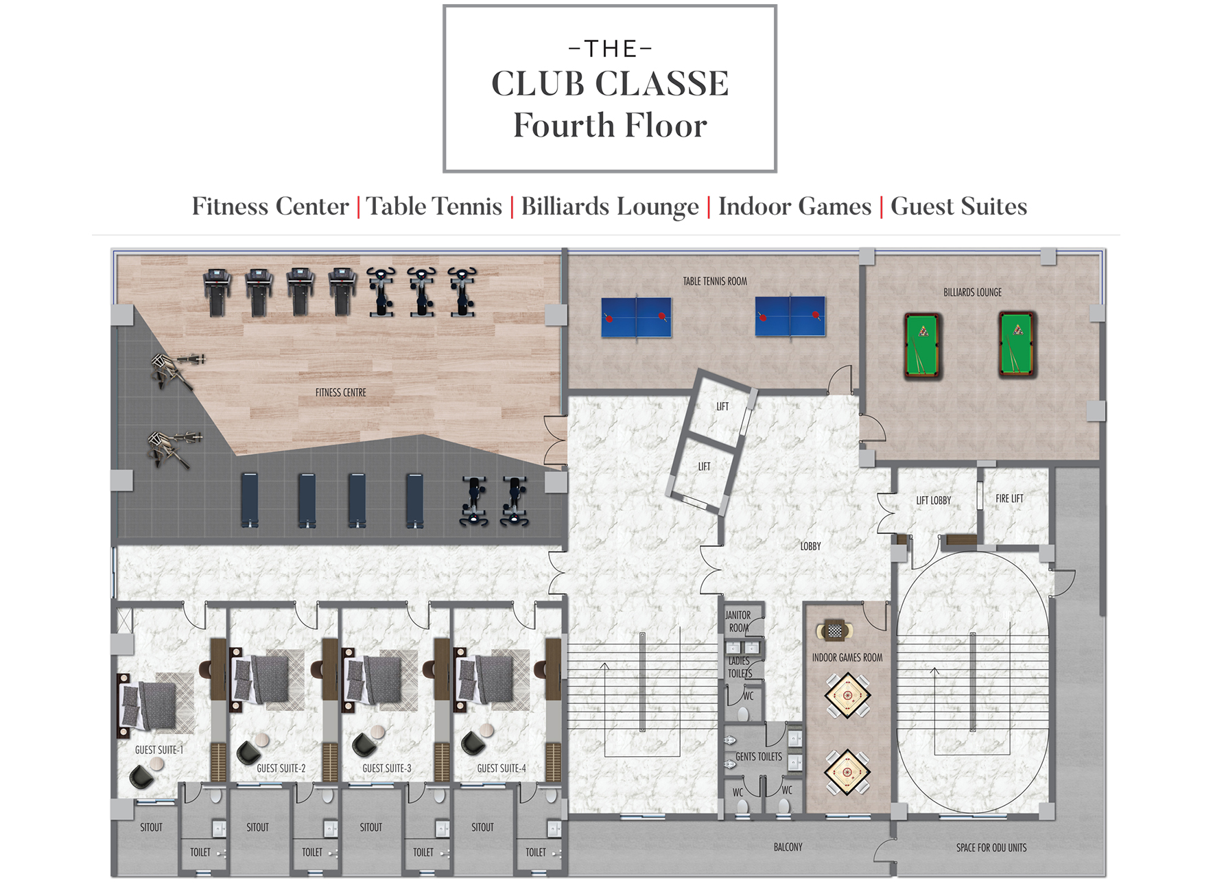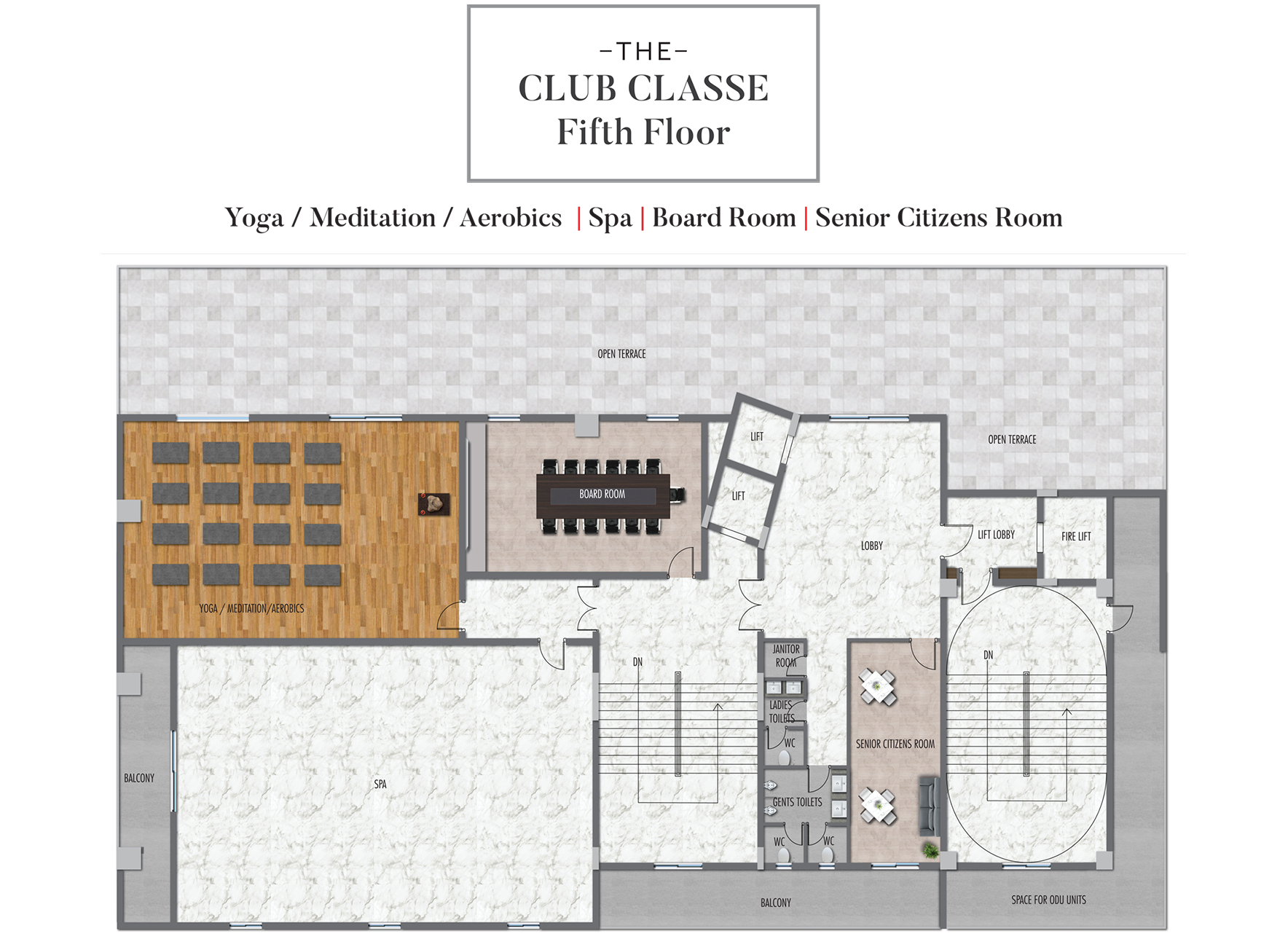 • Yoga / Meditation / Aerobics room with outdoor terrace area.